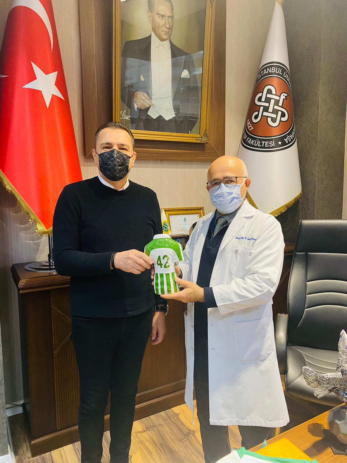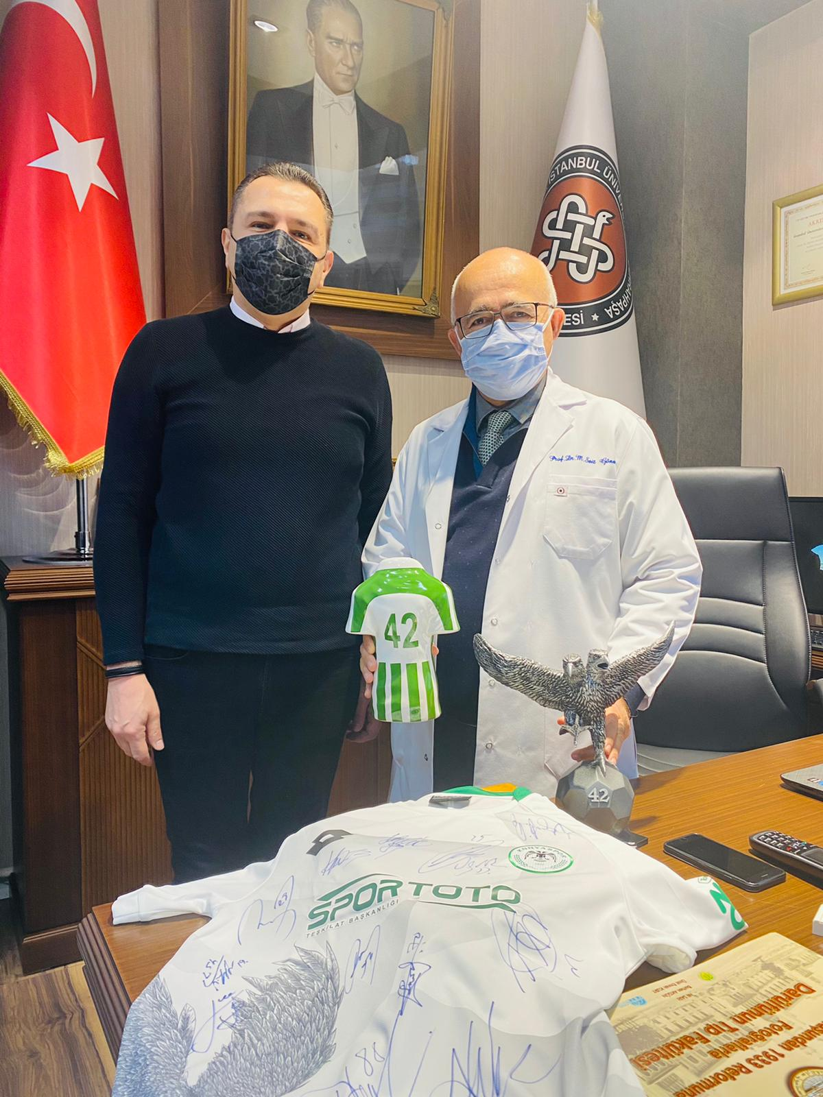 Genel Sekreterimiz Güven Öten, Konyaspor’umuzun eski başkanlarından, İstanbul Üniversitesi Cerrahpaşa Tıp Fakültesi Dekanı Prof. Dr. Sait Gönen’i makamında ziyaret etti. İttifak Holding Konyaspor’umuzun dünü, bugünü ve geleceğiyle ilgili değerlendirmelerin yapıldığı ziyarette Prof.Dr. sait Gönen, “ Şu an Konya’dan uzakta da olsak kalbimiz Konyaspor’la atıyor. Kazandığı hafta mutlu oluyoruz. Kaybettiğimizde haliyle üzülüyoruz. Ama bu sezon sakat oyuncuların eksikliğine rağmen takımımızın başarılı bir ivme yakaladığını görüyorum. İnşallah sezonun kalan kısmında çok daha güzel sonuçlar alacağız ve ligi üst sıralarda tamamlayacağız. Bu vesileyle Sayın Başkan Hilmi Kulluk Bey’e, yönetim kurulu üyelerine, teknik heyete ve futbolcularımıza başarılar diliyorum. Konyaspor’u her zaman yanında olduğumuzu bir kez daha ifade etmek istiyorum ”dedi. Genel Sekreterimiz Güven Öten de ziyarette yaptığı konuşmada, “ Yıllarca Konyaspor’umuza çok değerli hizmetleriniz oldu. Başkanlık yaptınız, dışarıdan desteklediniz. Şimdi İstanbul’daki çalışmalarınız emekleriniz hepimizi gururlandırıyor. İnşallah sizin de ifade ettiğiniz üzere sakatlarımızın takıma dönmesiyle çok daha önemli başarılara imza atacağımıza inancımız sonsuz ” ifadelerini kullandı. Genel Sekreterimiz Güven Öten ziyaretin sonunda Prof. Dr. Sait Gönen’e üzerinde isminin yazılı olduğu 42 numaralı forma ve minyatür çift başlı kartal heykelini hediye etti.