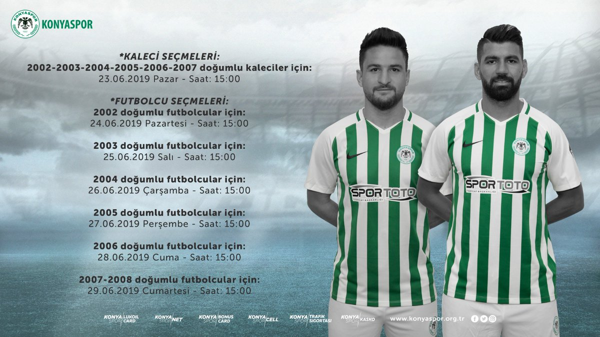 Konyaspor’umuzda Konya, Türkiye geneli ve yurt dışından 2002-2008 yılları arası doğumluların katılabileceği seçmelerin 23-29 Haziran tarihleri arasında M. Akif Ersoy Lisesi arkasında bulunan Cumhuriyet Sahası’nda yapılacak. Kulübümüz Futbol Akademisi faaliyet programı çerçevesinde yapılacak seçmeler için ücret olarak 50 TL alınacağı, adayların güncel sağlık raporlarını ibraz etmeleri gerektiği, adayların ayrıca seçmelere katılırken antrenman malzemelerini (forma, şort, tekmelik ve futbol ayakkabılarını) yanlarında getirmelerinin mecburi olduğu belirtildi. Seçmelere ilişkin program şöyle: *KALECİ SEÇMELERİ: 2002-2003-2004-2005-2006-2007 doğumlu kaleciler için: 23.06.2019 Pazar Saat:15.00 *2002 doğumlu futbolcular için: 24.06.2019 Pazartesi Saat:15.00 *2003 doğumlu futbolcular için: 25.06.2019 Salı Saat:15.00 *2004 doğumlu futbolcular için: 26.06.2019 Çarşamba Saat: 15.00 *2005 doğumlu futbolcular için: 27.06.2019 Perşembe Saat:15.00 *2006 doğumlu futbolcular için: 28.06.2018 Cuma Saat 15.00 *2007-2008 doğumlu futbolcular için: 29.06.2019 Cumartesi Saat:15.00 *SEÇMELERİN YAPILACAĞI YER: Selçuklu Cumhuriyet Sahası (Mehmet Akif Ersoy Lisesi arkası) Yol Tarifi İçin: https://goo.gl/maps/MeLZVa8MFr6PoQULA *GEREKLİ EVRAKLAR: *Sağlık raporu *Nüfus cüzdanı *Sporcular kendi malzemeleri ile katılacaktır. (Şort, tişört, krampon) *Katılım ücreti: 50 TL Önemli Hatırlatma: Konyaspor futbol okuluna kayıtlı öğrencilerimizin seçmeleri futbol okulumuzda yapılacaktır.