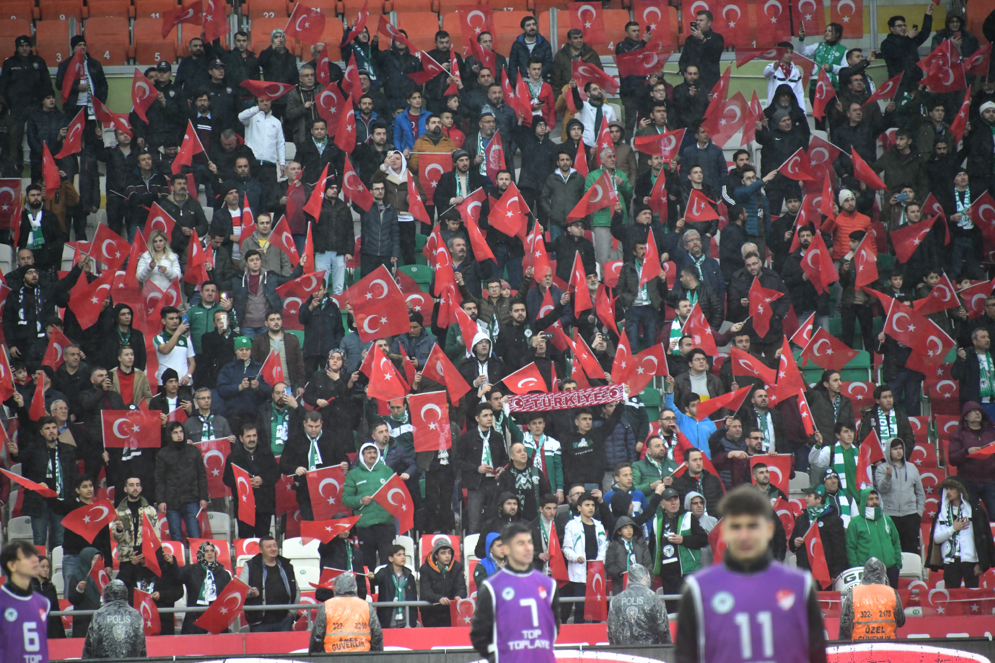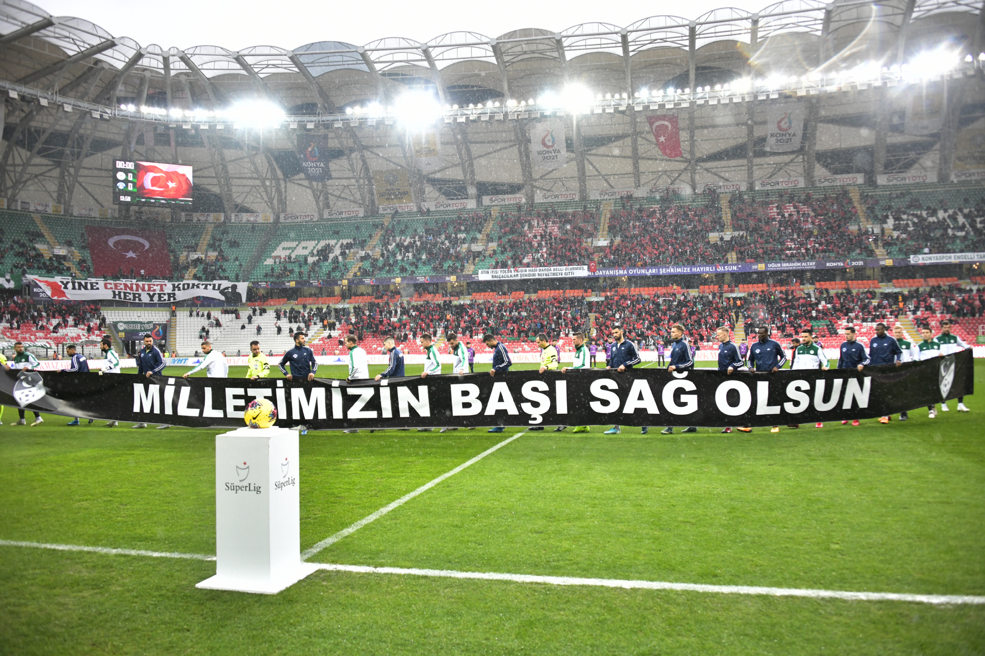Süper Lig’de 2019-2020 Cemil Usta Sezonu 24.hafta maçında Kasımpaşa’yı konuk eden İttifak Holding Konyaspor’umuz, gol atamadığı maçtan 0-0’lık beraberlikle ve 1 puanla ayrıldı. Konya Büyükşehir Belediyesi Stadyumu’nda saat 14:00’da başlayan karşılaşma öncesinde maçı izlemeye gelen taraftarlarımıza Türk bayrağı dağıtılırken, İdlib’de gerçekleşen hain saldırıda şehit olan kahraman Mehmetçiklerimizin fotoğrafları ve isimleri ekrana yansıtılıp anons edildi ve tüm taraftarlarımız ‘BURADA’ diyerek anonslara eşlik etti. Maç öncesinde hakemler ve her iki takım oyuncuları ise seremoniye ‘MİLLETİMİZİN BAŞI SAĞOLSUN’ yazılı TFF’nin pankartı ile çıktı. Karşılaşmanın ilk yarısında Kasımpaşa kalesinde etkili olan takımımız yakaladığı iki fırsatı değerlendiremedi ve ilk yarı başladığı gibi golsüz sona erdi. İkinci yarıya Levan Shengelia’nın yerine Rogerio Thuram’ı alarak başlayan takımımız rakip kalede baskı kurmasına rağmen son paslarda etkili olamadı. Kalan dakikalarda çabalar sonucu değiştirmeye yetmedi ve mücadele 0-0 sona erdi. İttifak Holding Konyaspor’umuz bu sonuçla haftayı 22 puanla tamamladı. STAD: Konya Büyükşehir Belediyesi HAKEMLER: Ali Palabıyık, Serkan Olguncan, Mustafa Sönmez İTTİFAK HOLDİNG KONYASPOR: Serkan, Skubic, Selim Ay, Uğur Demirok, Guilherme, Jens Jonsson, Amir Hadziahmetovic, Ömer Ali Şahiner (Dk.75 Paolo Hurtado), Robert Mak (Dk.65 Riad Bajic), Levan Shengelia (Dk.46 Rogerio Thuram), Deni Milosevic YEDEKLER: Ertuğrul, Ali Turan, Marin Anicic, Volkan fındıklı, Alper Uludağ, Ferhat Öztorun, Marko Jevtovic TEKNİK SORUMLU: Bülent Korkmaz KASIMPAŞA: Ramazan, Hadergjonaj, Meriah, Brecka (Dk.13 Jorge Fernandes), Haddadi, Tirpan, Aytaç Kara, Hajradinovic, Quaresma (Dk.76 Yusuf Erdoğan), Thiam, Koita (dk.59 Ndongala) YEDEKLER: Murat Can, Berk, D.Haspolat, Tarkan Serbest, İlhan Depe, Anıl Koç, Gohou TEKNİK SORUMLU: Fuat Çapa SARI KART: Paolo Hurtado (İttifak Holding Konyaspor) GOL: Yok
