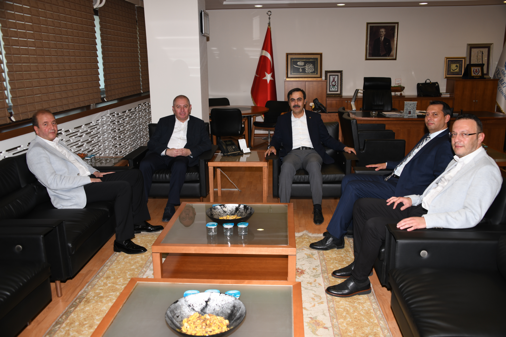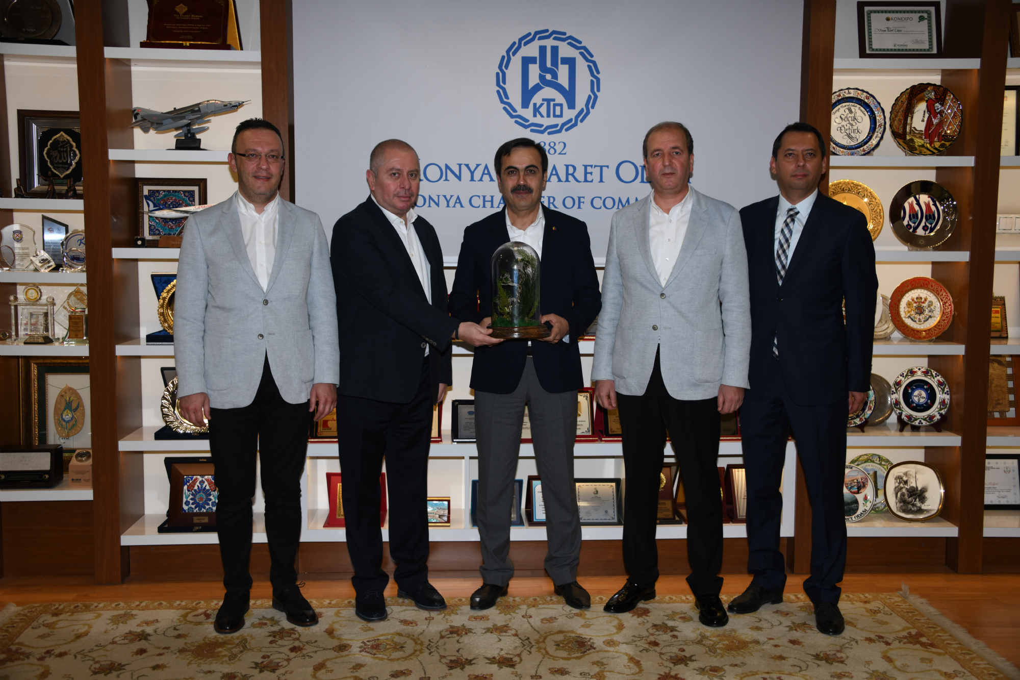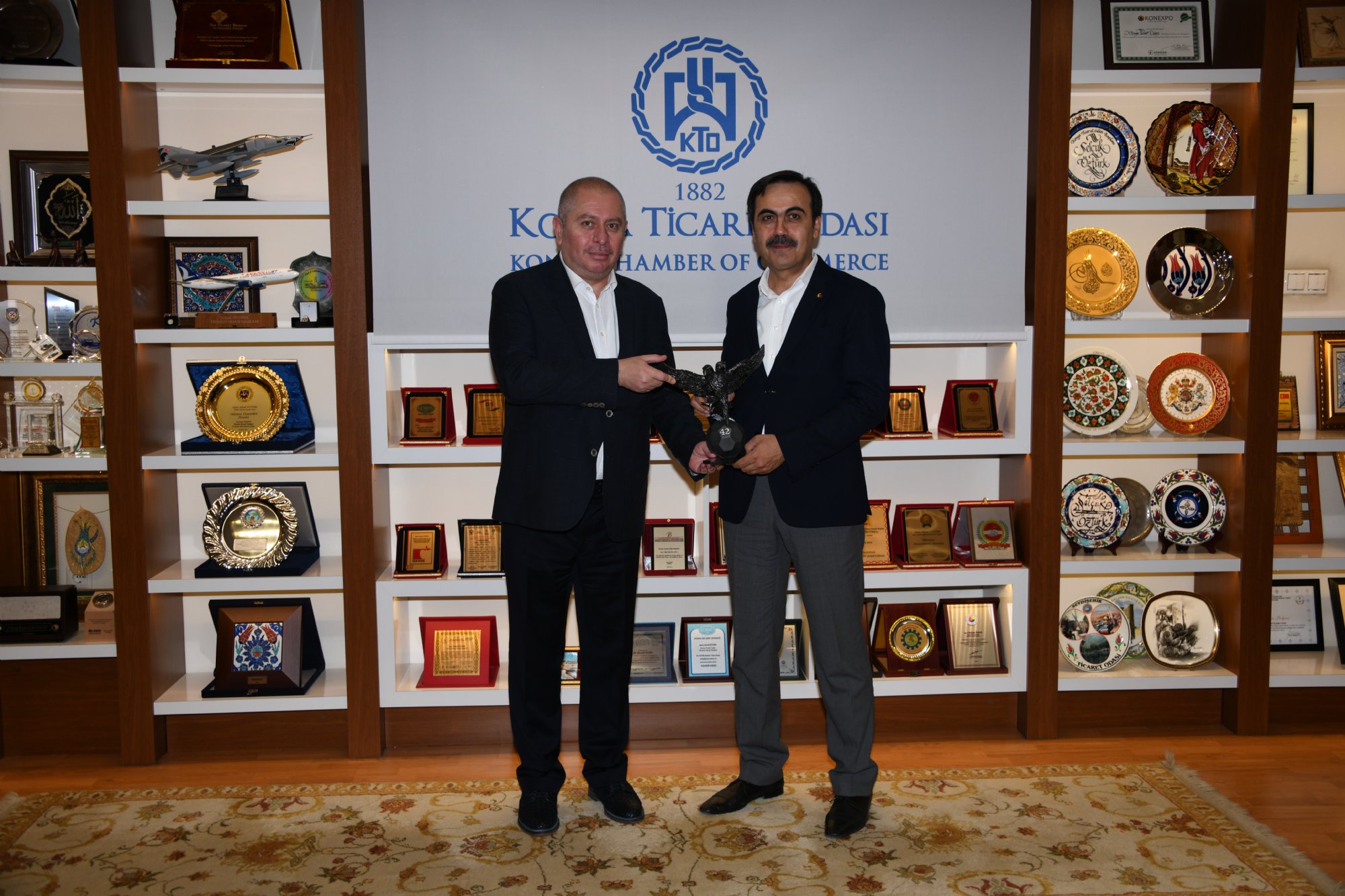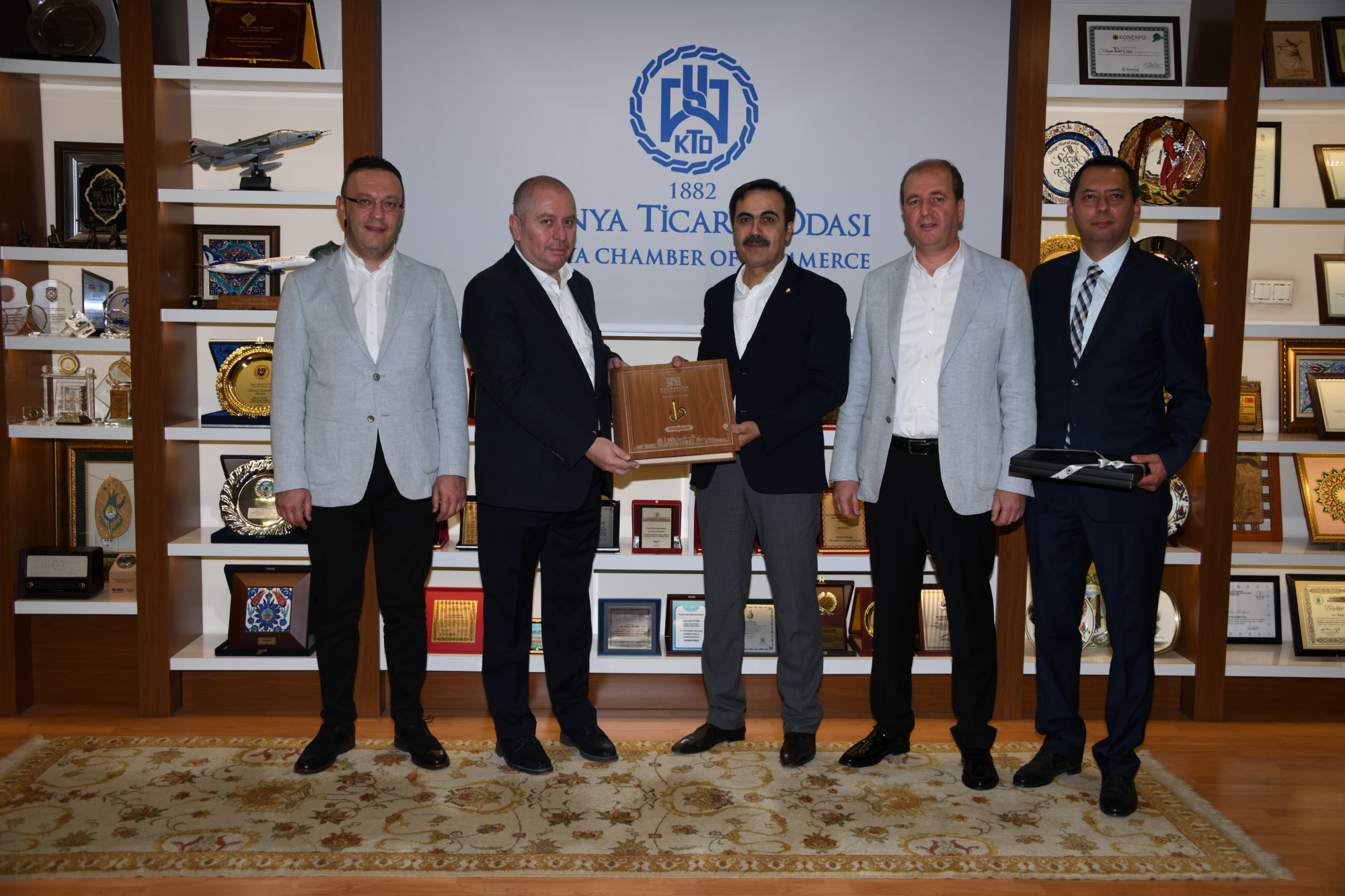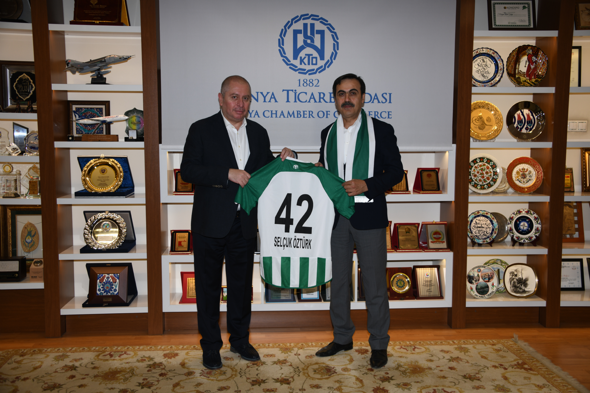 Başkanımız Hilmi Kulluk, Başkanvekilimiz Celalettin Yılmaz, Başkan Yardımcılarımız Osman Koçak ve Mustafa Aydınalp Konya Ticaret Odası Başkanı ve Karatay Üniversitesi Mütevelli Heyeti Başkanı Selçuk Öztürk’ü makamında ziyaret etti. 2019-2020 futbol sezonunda giyeceğimiz formaların tanıtım filminde kullanılan, dekor, plato ve kostümler için büyük destek sağlayan Karatay Üniversitesi Mütevelli Heyeti Başkanı Selçuk Öztürk’ü ziyaret eden Konyaspor Heyeti katkılarından dolayı kendisine teşekkür etti. Ziyarette forma tanıtım filminin yanı sıra Konyaspor’umuzun bugünü ve yarınına ilişkin projeler konuşuldu. Teşekkür ziyaretinin sonunda Başkanımız Hilmi Kulluk, Konya Ticaret Odası Başkanı Selçuk Öztürk’e üzerinde isminin yer aldığı 42 numaralı forma ve çift başlı kartal heykelinin minyatürünü, KTO Başkanı ve Karatay Üniversitesi Mütevelli Heyeti Başkanı Selçuk Öztürk ise Başkanımız Hilmi Kulluk ile Başkanvekilimiz Celalettin Yılmaz, Başkan Yardımcılarımız Osman Koçak ve Mustafa Aydınalp'e geçmişten günümüze Konya fotoğraf albümü ve Hattat Hüseyin Öksüz Hocanın tün eserlerinin yer aldığı Medreseden üniversiteye isimli hat sanatıyla yazılmış büyük eseri hediye etti.