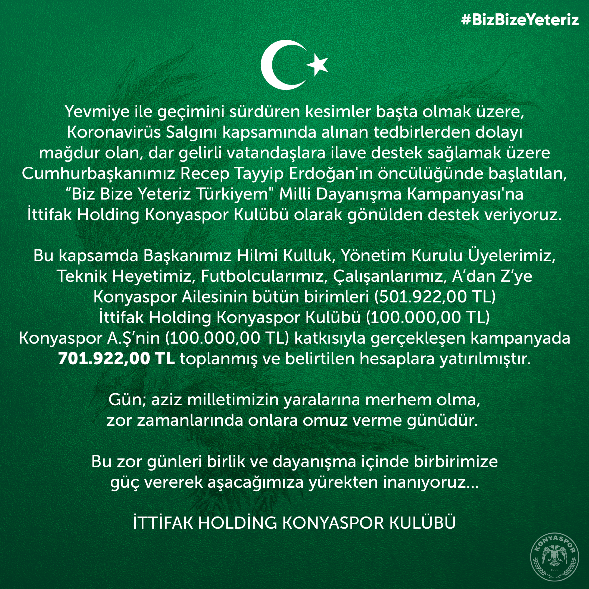 Yevmiye ile geçimini sürdüren kesimler başta olmak üzere, Koronavirüs Salgını kapsamında alınan tedbirlerden dolayı mağdur olan, dar gelirli vatandaşlara ilave destek sağlamak üzere Cumhurbaşkanımız Recep Tayyip Erdoğan'ın öncülüğünde başlatılan, “Biz Bize Yeteriz Türkiyem" Milli Dayanışma Kampanyası'na İttifak Holding Konyaspor Kulübü olarak gönülden destek veriyoruz. Bu kapsamda Başkanımız Hilmi Kulluk, Yönetim Kurulu Üyelerimiz,Teknik Heyetimiz, Futbolcularımız, Çalışanlarımız, A’dan Z’ye Konyaspor Ailesinin bütün birimleri (501.922.00 TL) İttifak Holding Konyaspor Kulübü (100.000.00 TL) Konyaspor A.Ş’nin (100.000.00 TL) katkısıyla gerçekleşen kampanyada 701.922.00 TL toplanmış ve belirtilen hesaplara yatırılmıştır. Gün; aziz milletimizin yaralarına merhem olma, zor zamanlarında onlara omuz verme günüdür. Bu zor günleri birlik ve dayanışma içinde birbirimize güç vererek aşacağımıza yürekten inanıyoruz... İTTİFAK HOLDİNG KONYASPOR KULÜBÜ