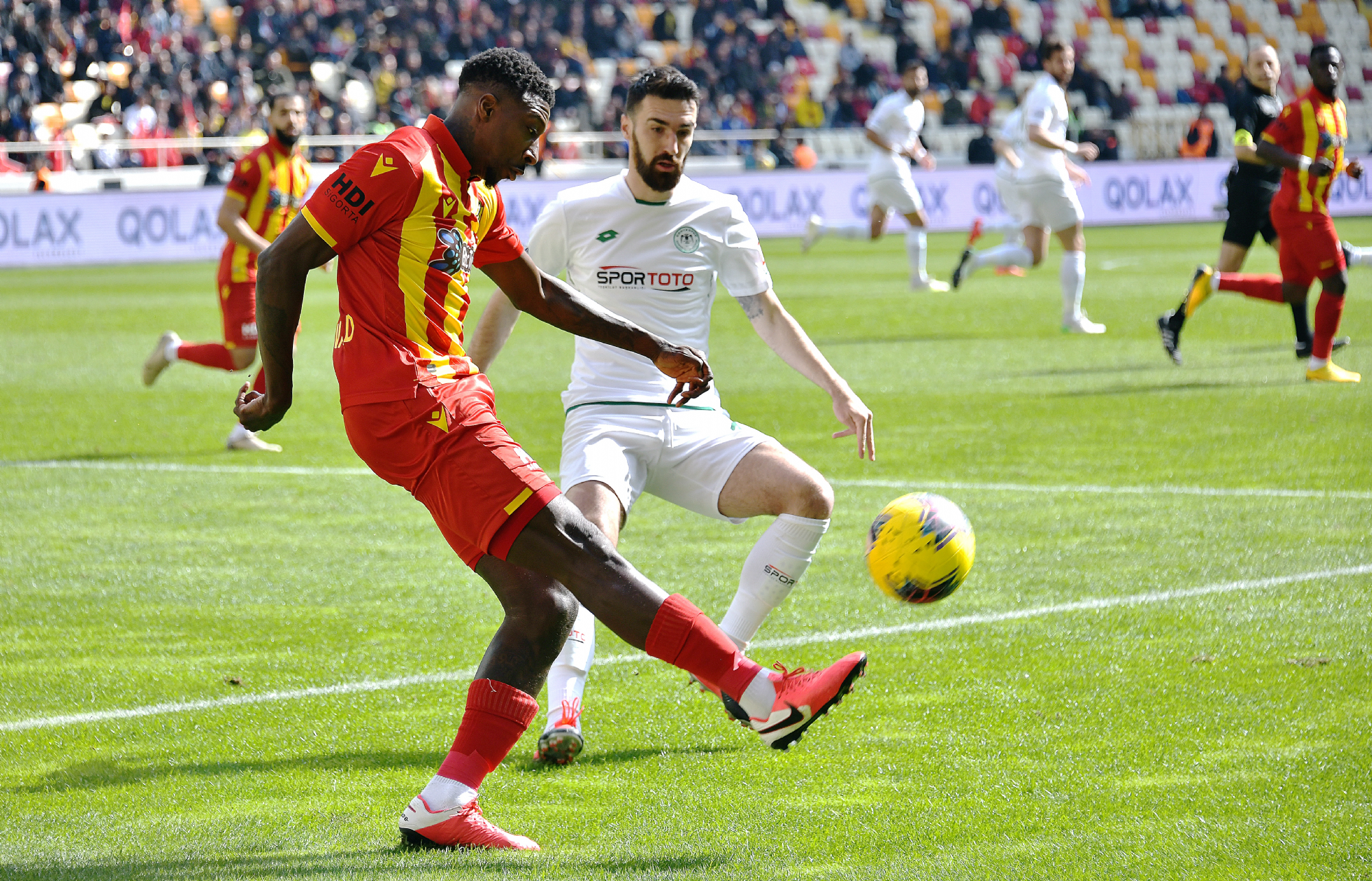 Süper Lig’de 25.hafta maçında deplasmanda BtcTurk Y.Malatyaspor ile karşılaşan İttifak Holding Konyaspor’umuz, ilk yarısını 1-0 önde tamamladığı mücadeleden 1-1’lik skorla ayrıldı. Yeni Malatya Stadyumu’nda saat 14:00’da başlayan karşılaşmaya istekli başlayan takımımız Riad Bajic ve Amir Hadziahmetovic ile yakaladığı fırsatlarda kaleci Farnolle’yi geçemezken, 45+2.dakikada Riad Bajic ceza sahası içerisinde yerde kaldı. Hakem Cüneyt Çakır Chebake’yi kırmızı kartla oyun dışına gönderirken, kazanılan penaltıyı Riad Bajic gole çevirdi ve takımımız ilk yarıyı 1-0 önde tamamladı. 10 kişi kalan rakibi karşısında ikinci yarı yine fırsatlar bulan takımımız 80.dakikada Murat Yıldırım’ın golüne engel olamadı ve skora 1-1 ile denge geldi. 88.dakikada ceza sahası dışında topu elle oynayan kalecimiz Serkan Kırıntılı kırmızı kart ile oyun dışı kaldı. Her iki takımında 10 kişi tamamladığı mücadele 1-1 sona erdi. STAD: Yeni Malatya HAKEMLER: Cüneyt Çakır, Bahattin Duran, Tarık Ongun BTCTURK Y.MALATYASPOR: Farnolle, Chebake, Mustafa Akbaş, Robin Yalçın, Karim Hafes, Murat Yıldırım, Acquah, Donald (Dk.68 Kjartansson), Gökhan Töre, Fofana (Dk.90+2 Chalali), Umut Bulut (Dk.57 Bifouma) YEDEKLER: Ufuk, Erkan Kaş, Yiğithan, Youssuf, Özer, Sakıb TEKNİK SORUMLU: Hikmet Karaman İTTİFAK HOLDİNG KONYASPOR: Serkan Kırıntılı, Nejc Skubic, Selim Ay, Uğur Demirok, Guilherme, Jens Jonsson, Amir Hadziahmetovic, Ömer Ali Şahiner (Dk.90 Ertuğrul Taşkıran), Levan Shengelia (Dk.72 Paolo Hurtado), Deni Milosevic, Riad Bajic (Dk.78 Rogerio Thuram) YEDEKLER: Mücahit Atalay, Volkan, Ali Turan, Marko Jevtovic, Alper Uludağ, Ali Karakaya, Ferhat Öztorun TEKNİK SORUMLU: Bülent Korkmaz KIRMIZI KARTLAR: Chebake (Dk.45+2) (BtcTurk Y.Malatyaspor), Serkan Kırıntılı (Dk.88) (İttifak Holding Konyaspor) SARI KARTLAR: Mustafa Akbaş (BtcTurk Y.Malatyaspor), Levan Shengelia, N.Skubic (İttifak Holding Konyaspor) GOLLER: Riad Bajic (Dk.45+3) (İttifak Holding Konyaspor), Murat Yıldırım (Dk.80) (BtcTurk Y.Malatyaspor)